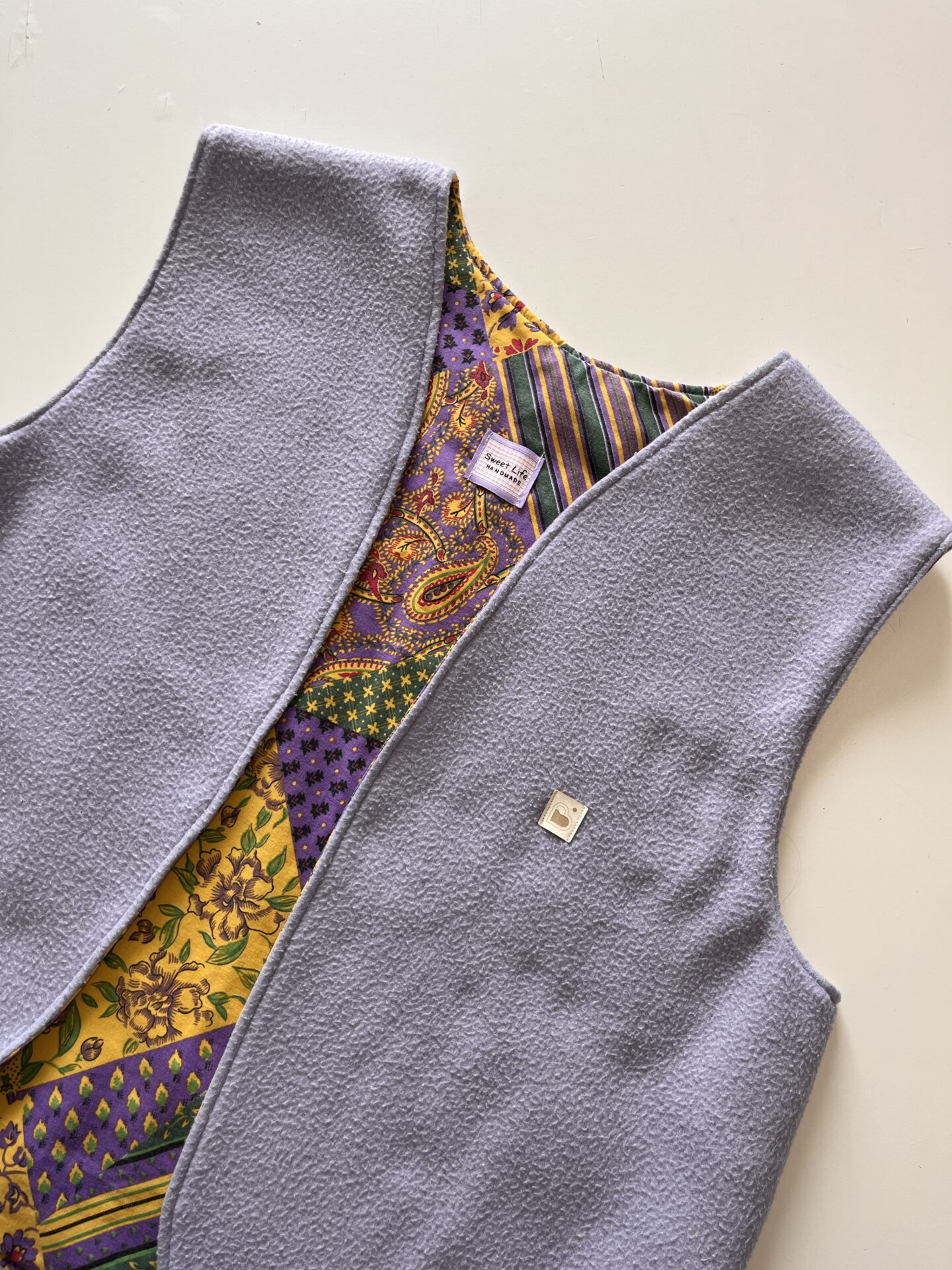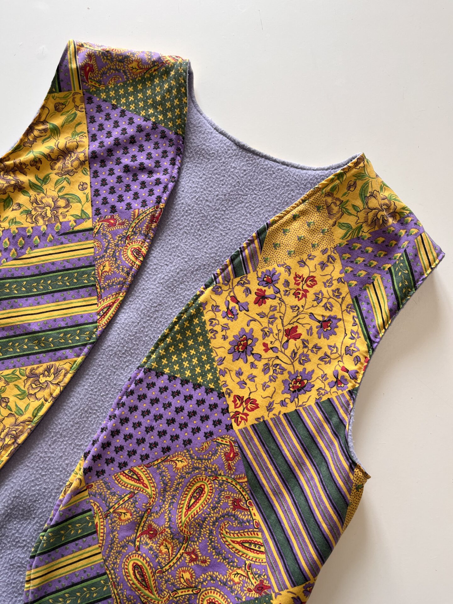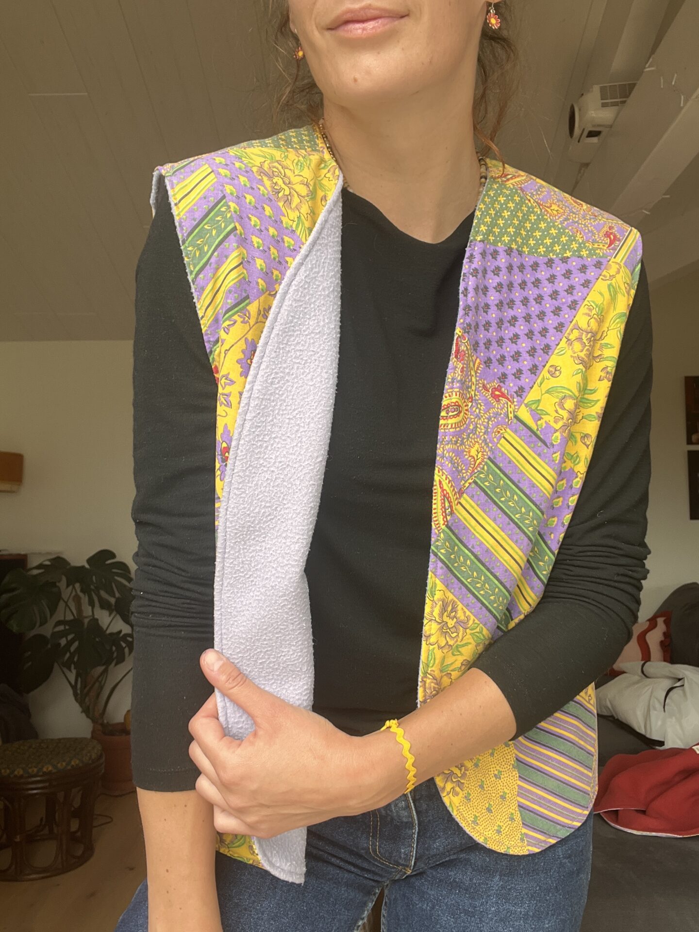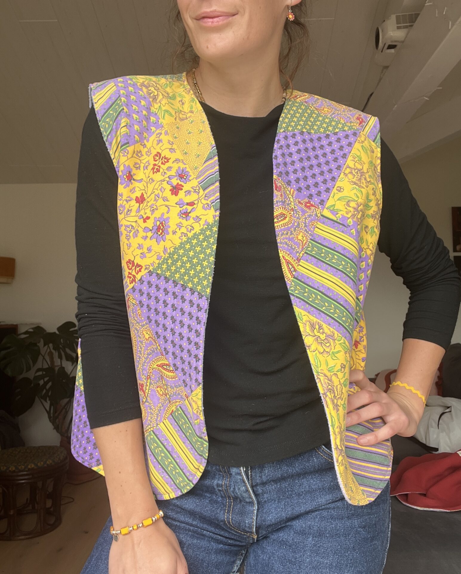 Gilet sans manches cousu à partir de tissu de seconde main et customisé en pièce unique.