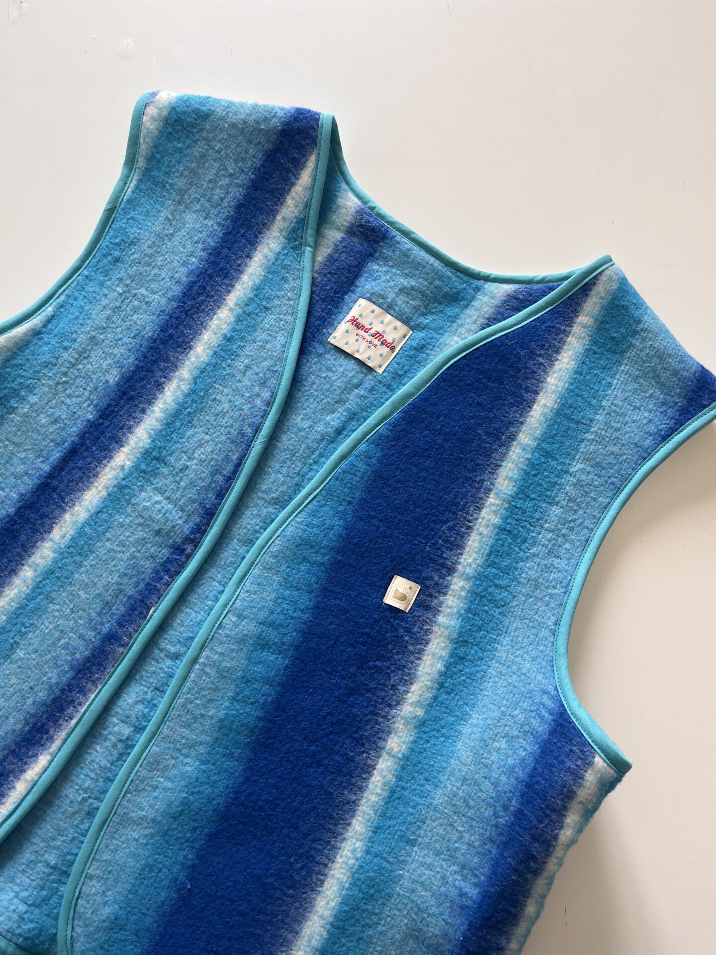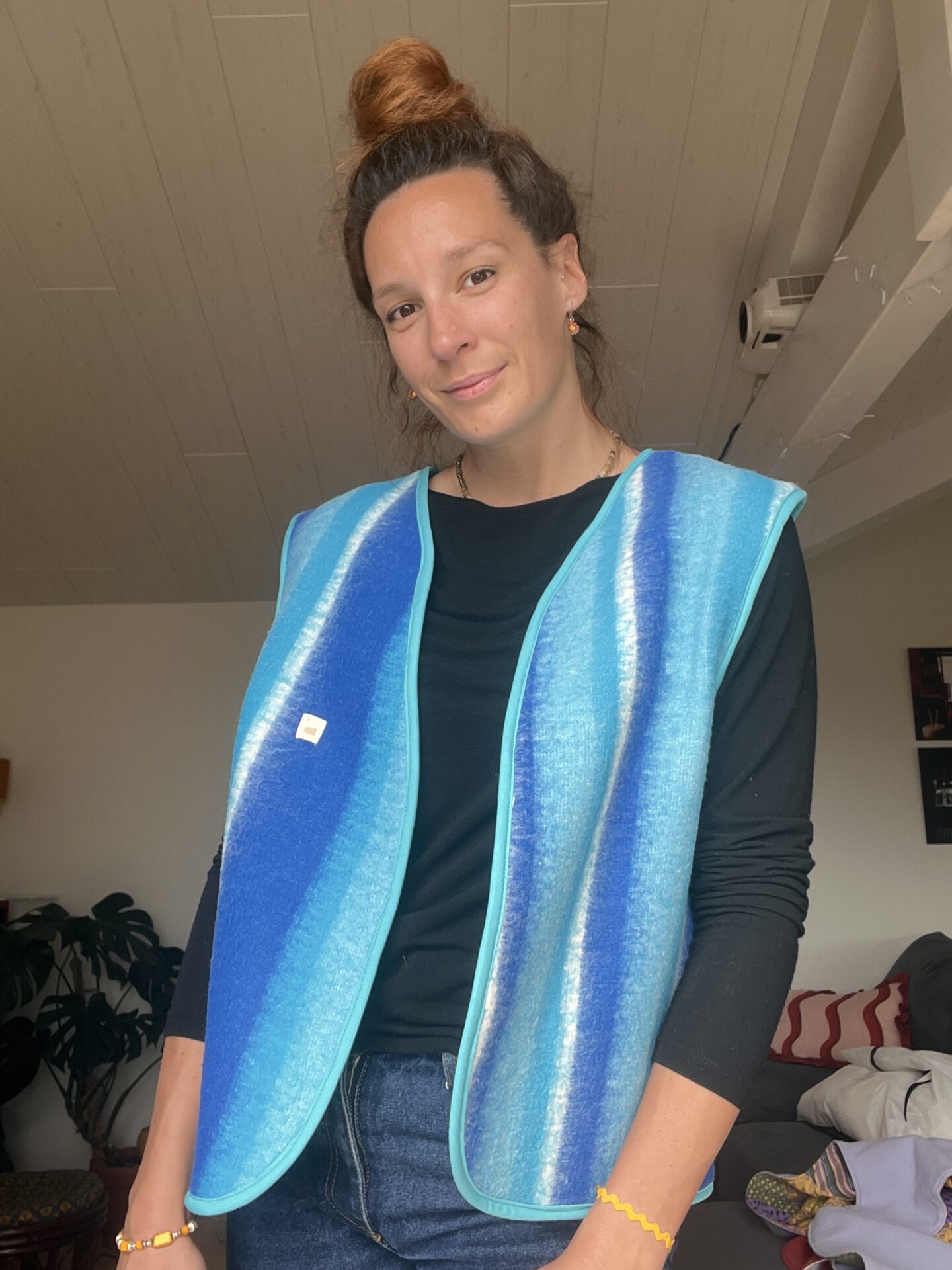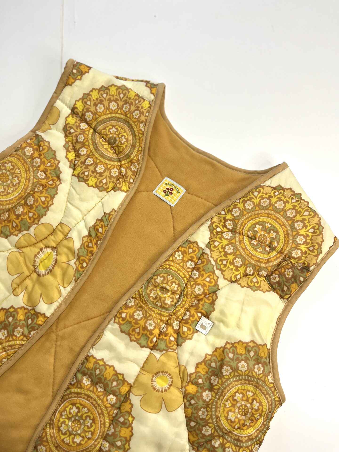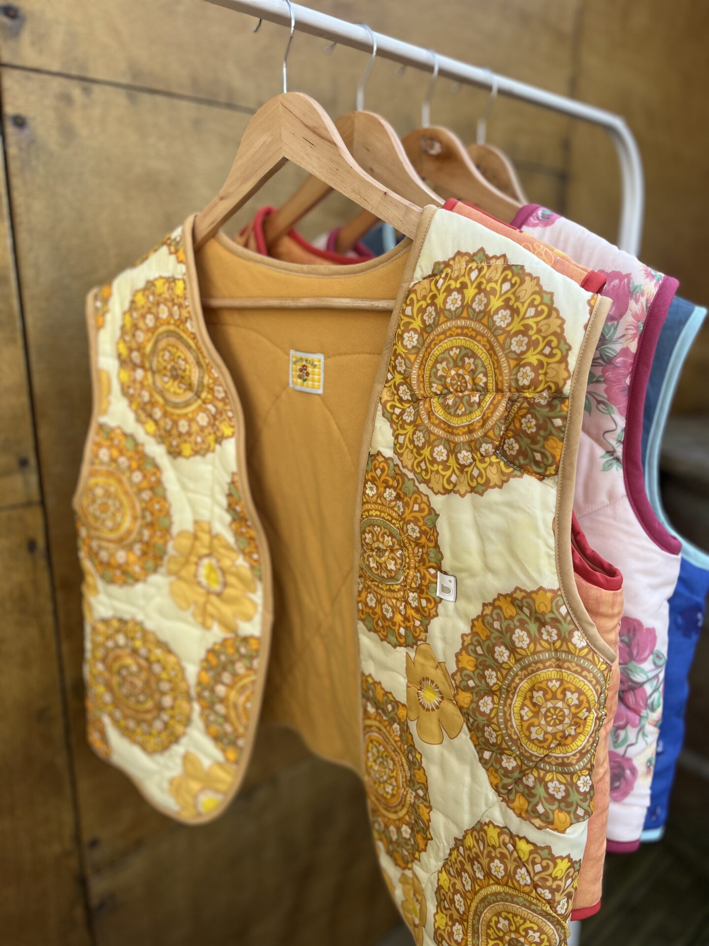 Gilet sans manches cousu à partir de tissu de seconde main et customisé en pièce unique.