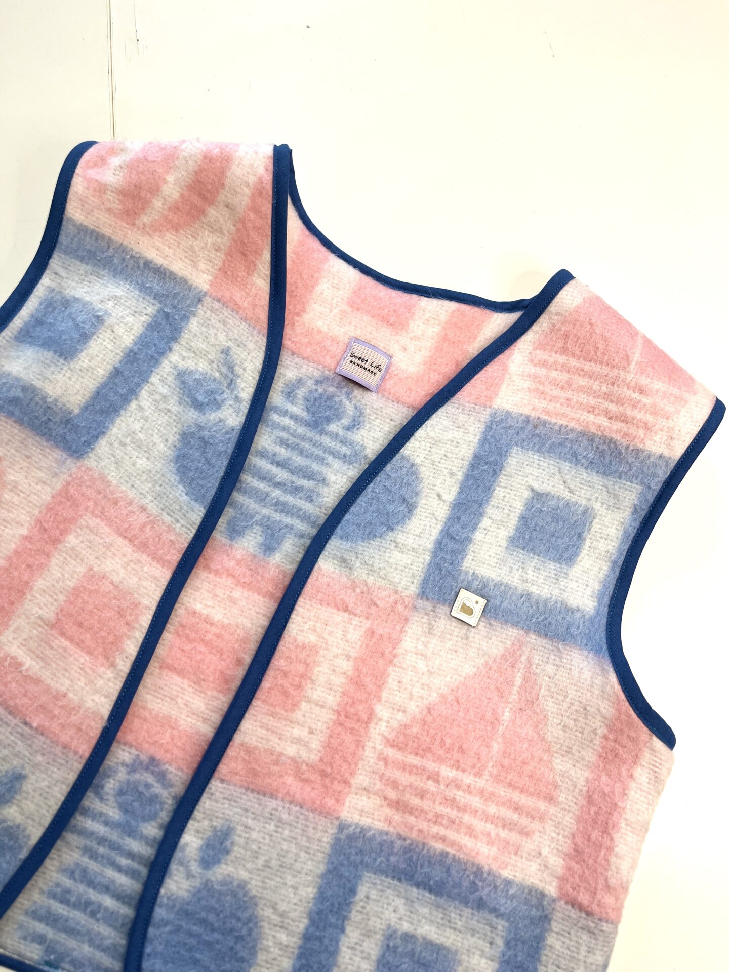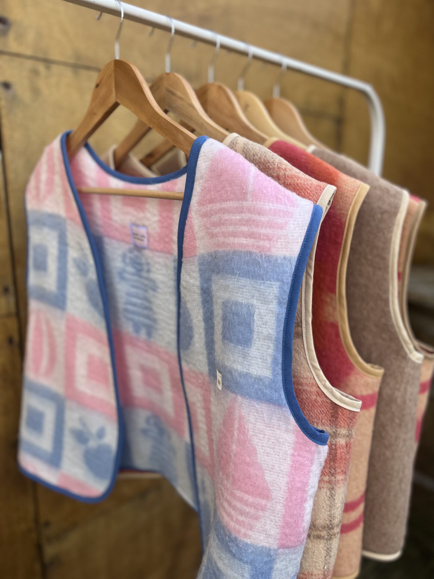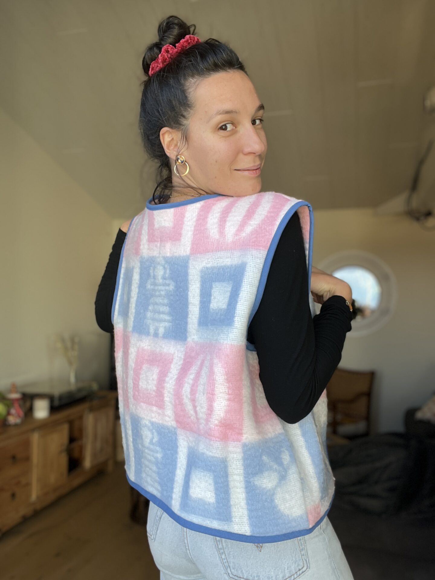 Gilet sans manches cousu à partir de tissu de seconde main et customisé en pièce unique.