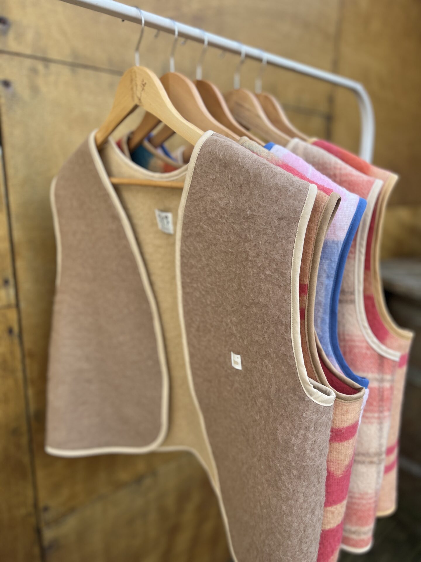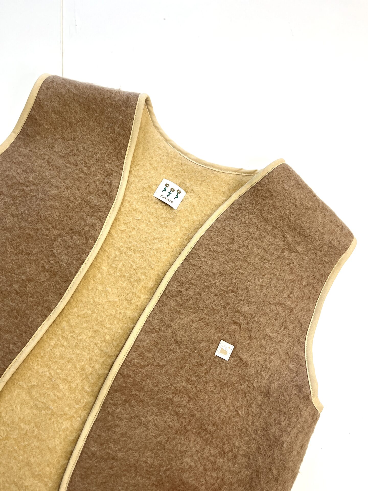 Gilet sans manches cousu à partir de tissu de seconde main et customisé en pièce unique.