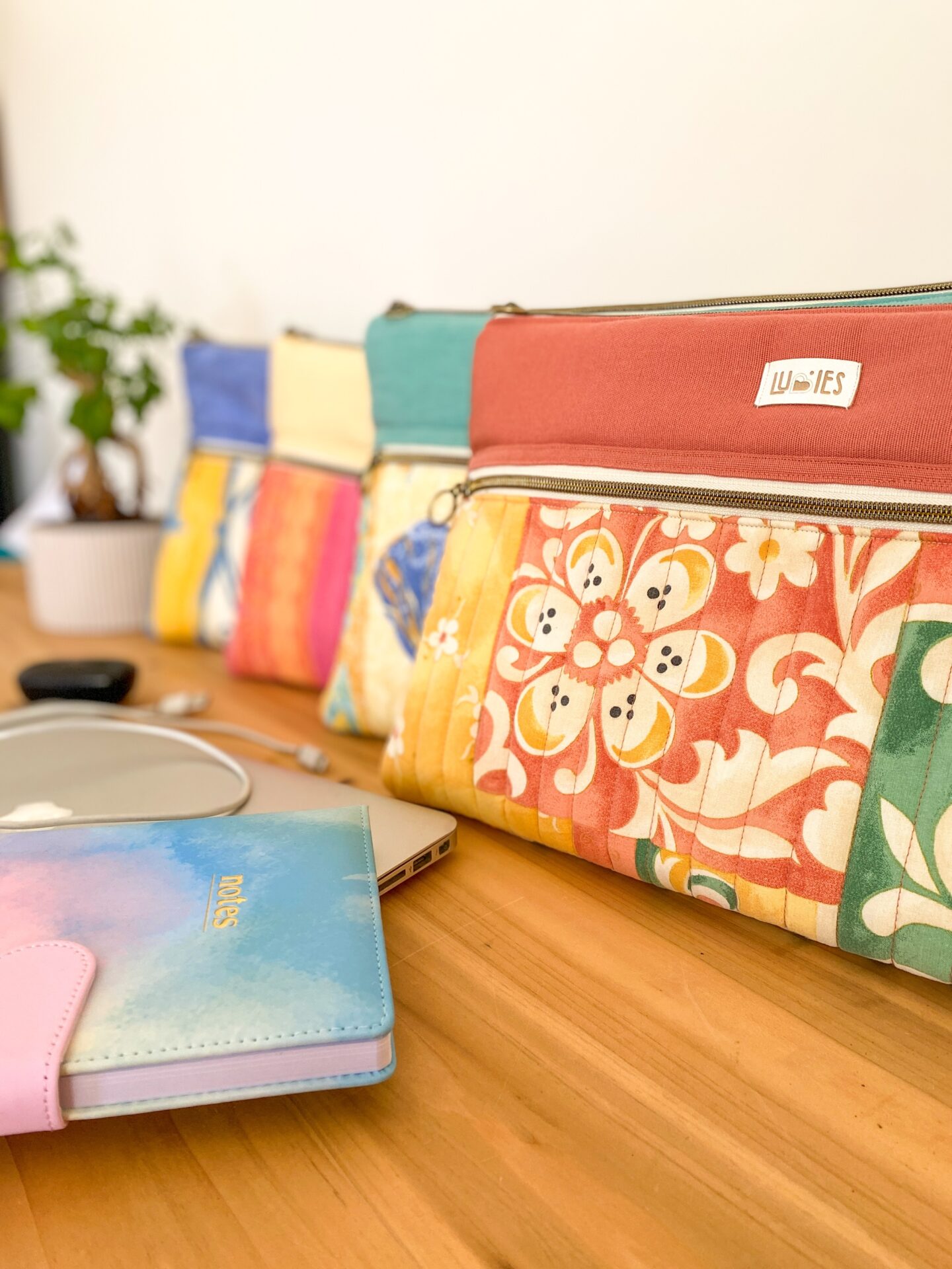 Pochette d’ordinateur cousue en tissus upcyclés, fabriquée à partir d’anciens draps et taies d’oreiller.
